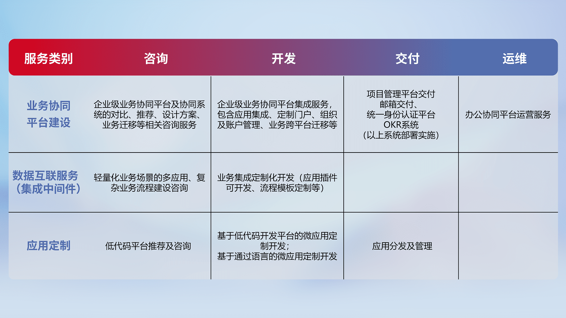 针对钉钉、、、企微、、IDaas等平台级产品提供产品的规划、、、方案、、、交付、、、定制化开发等服务,,实现如统一协同办公、、智能客户服务、、、、混合会议管理、、、、智能数据查询、、、等业务场景,,,,实现数字化转型。。。